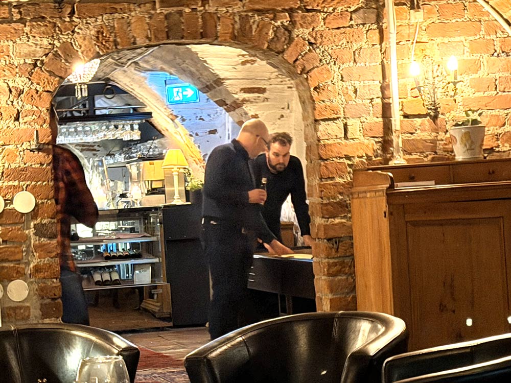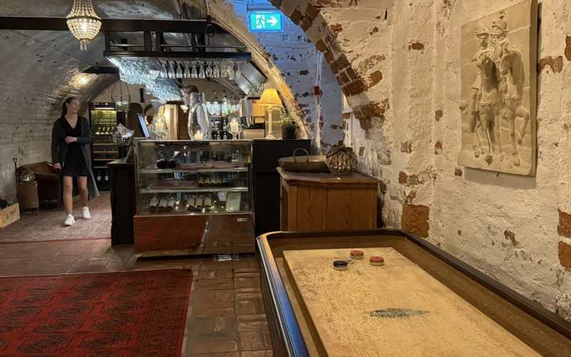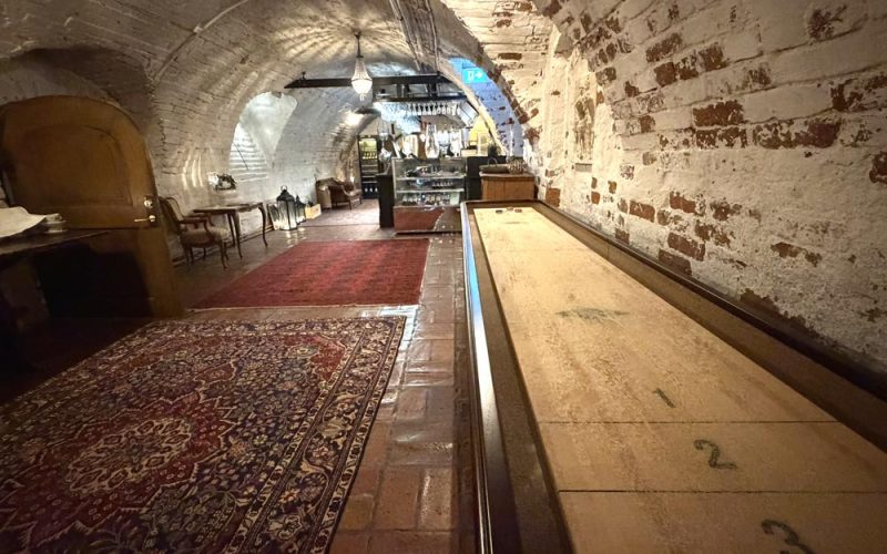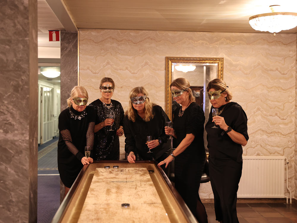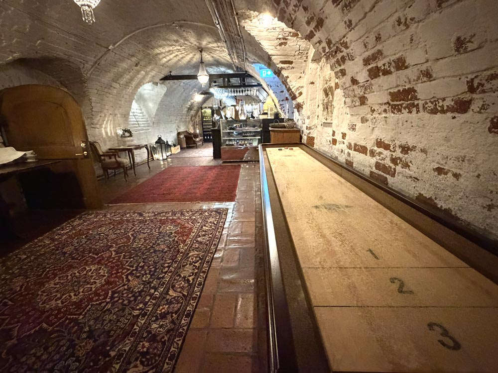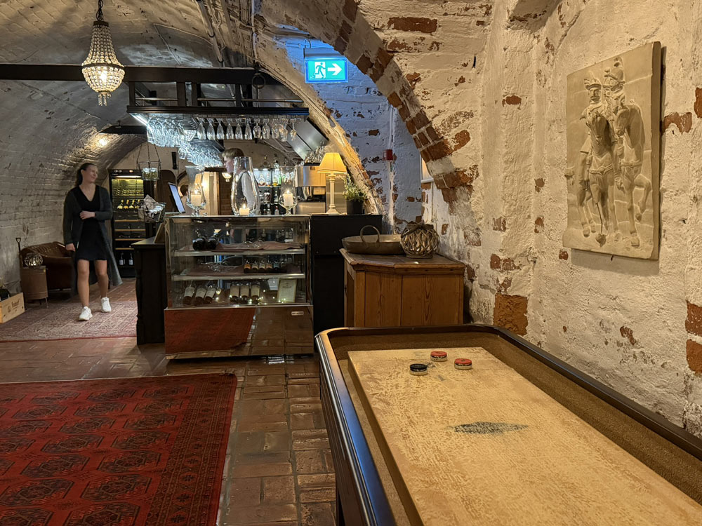 Shuffleboard i hotellets lobby och i slottsvalvens bar.